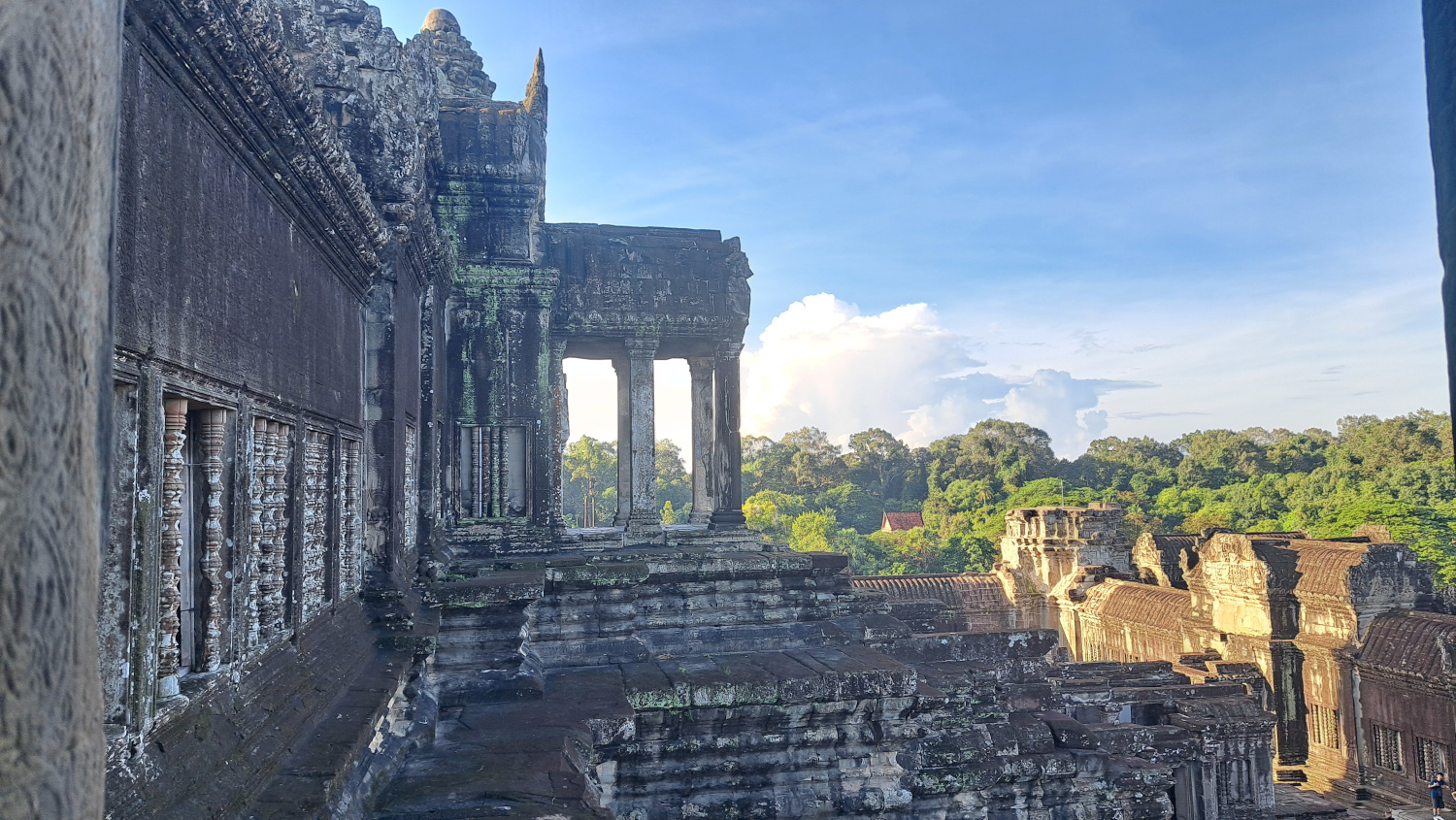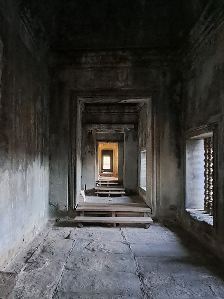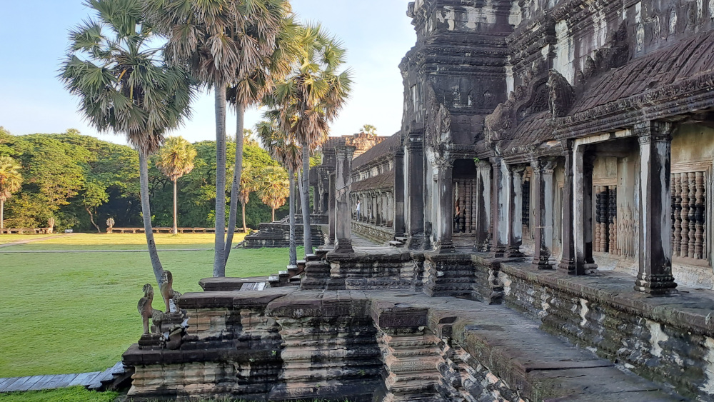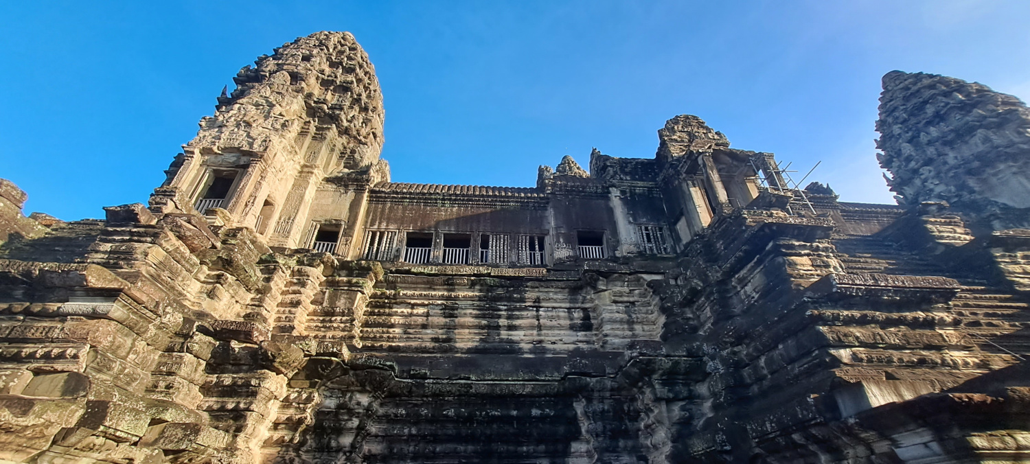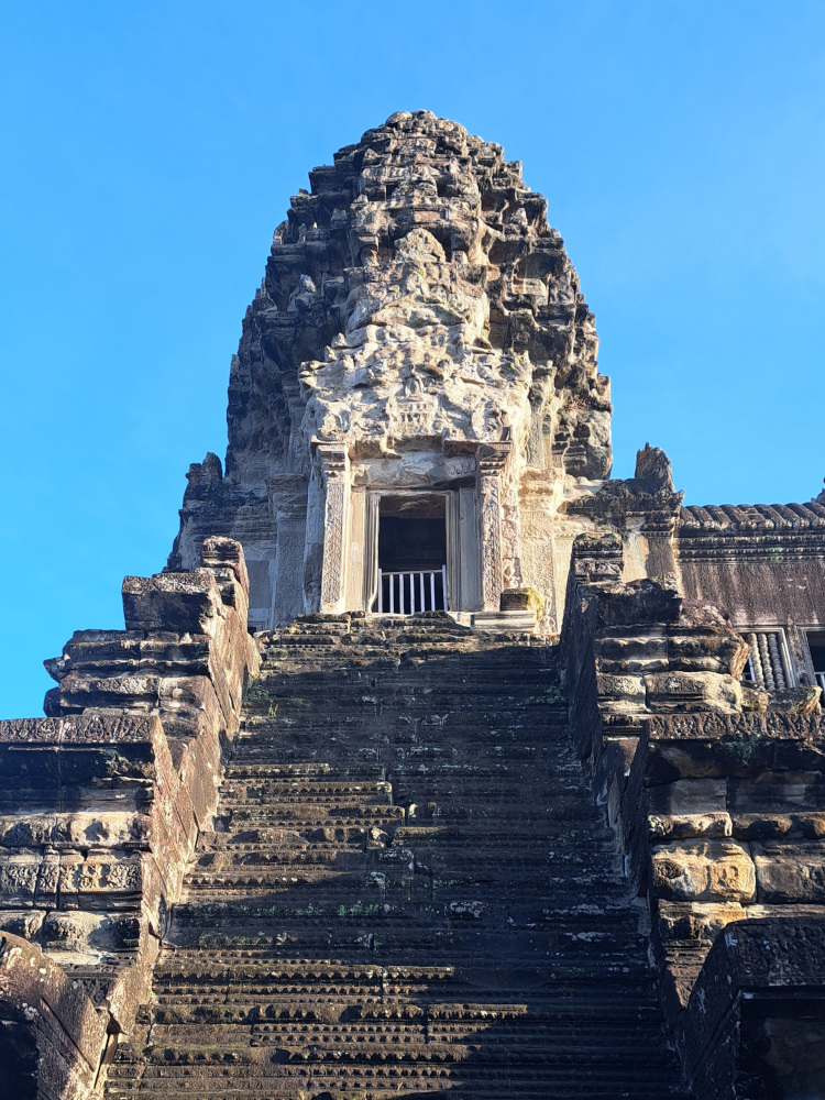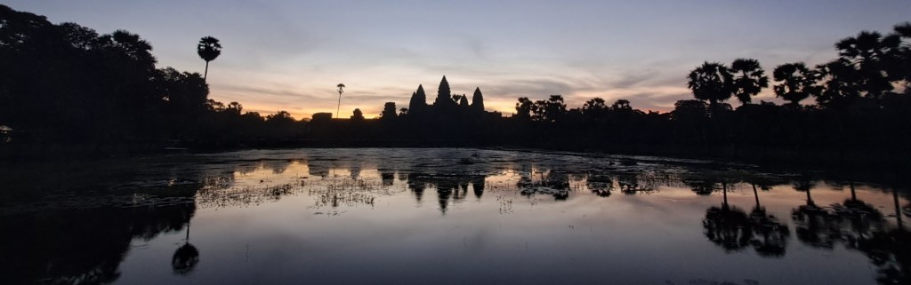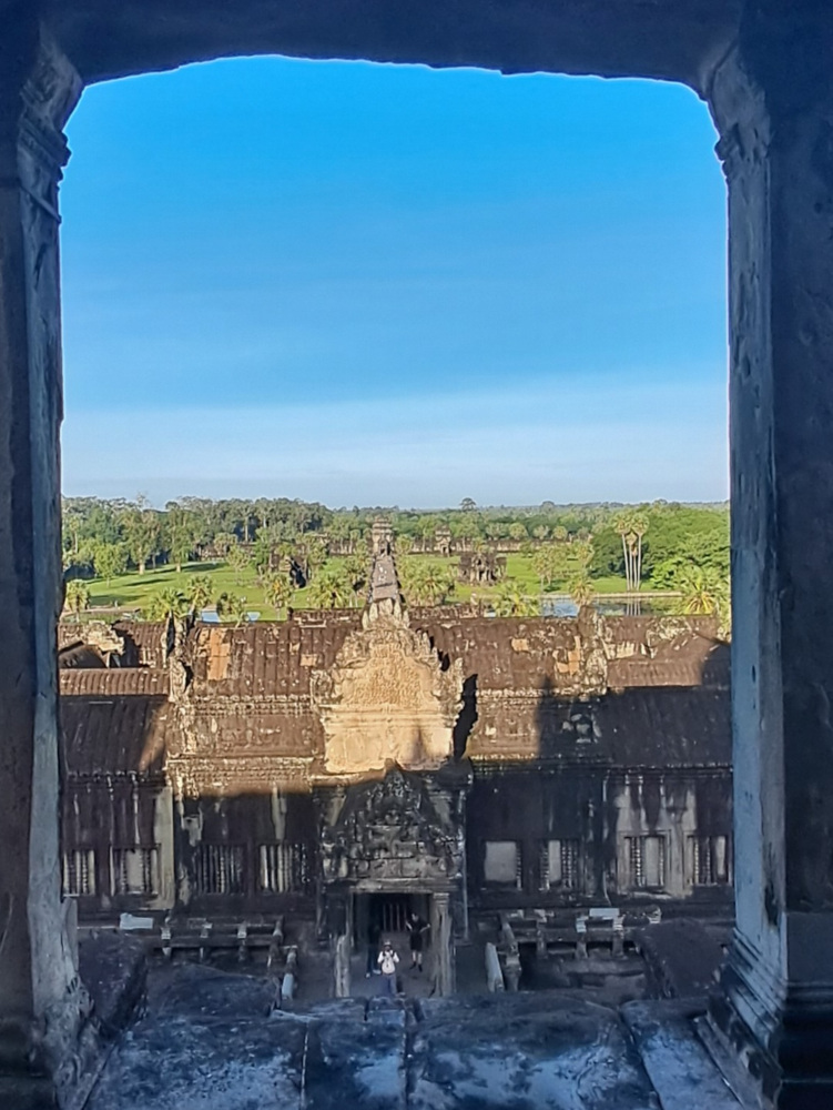 Le site d’Angkor fut la capitale de l’Empire khmer du IXe au XVe siècle. D’abord dédié à la religion hindoue (avec le dieu Vishnou en figure centrale), il est devenu un lieu bouddhiste vers le XIIIe siècle. C’est pourquoi vous y verrez à la fois des sculptures hindoues et des visages de Bouddha paisibles taillés dans la pierre. À son apogée, Angkor comptait plus de 1000 temples ! C’était la plus grande ville du monde à l’époque… bien plus grand que Paris.