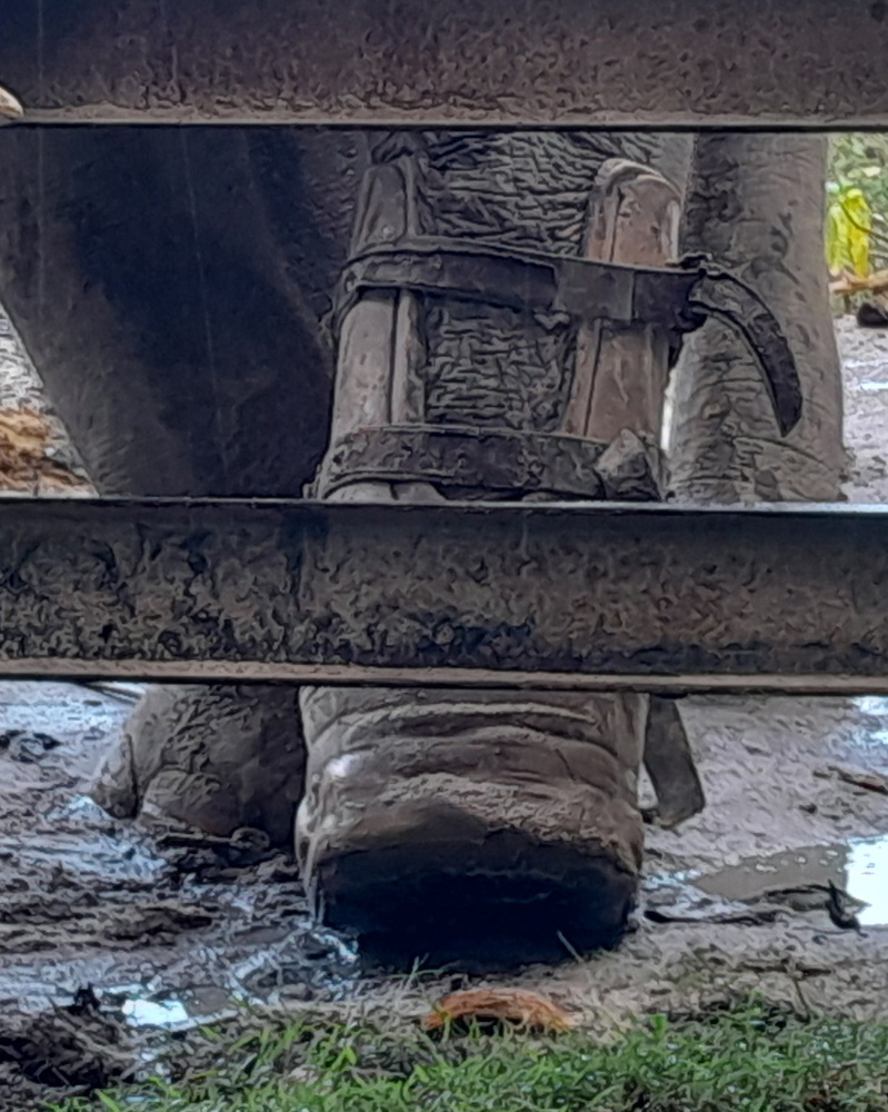 âIl sâest coincĂ© la patte dans un piĂšge dans la forĂȘt. On a dĂ» lâamputer⊠Depuis, il porte une prothĂšse que lâon refait tous les 6 mois, car il grandit vite. Ce nâest pas facile de marcher sur trois pattes quand on pĂšse une tonne⊠mais il tient bon !â