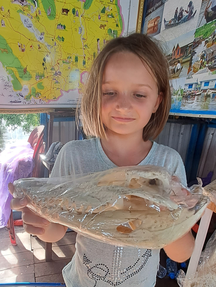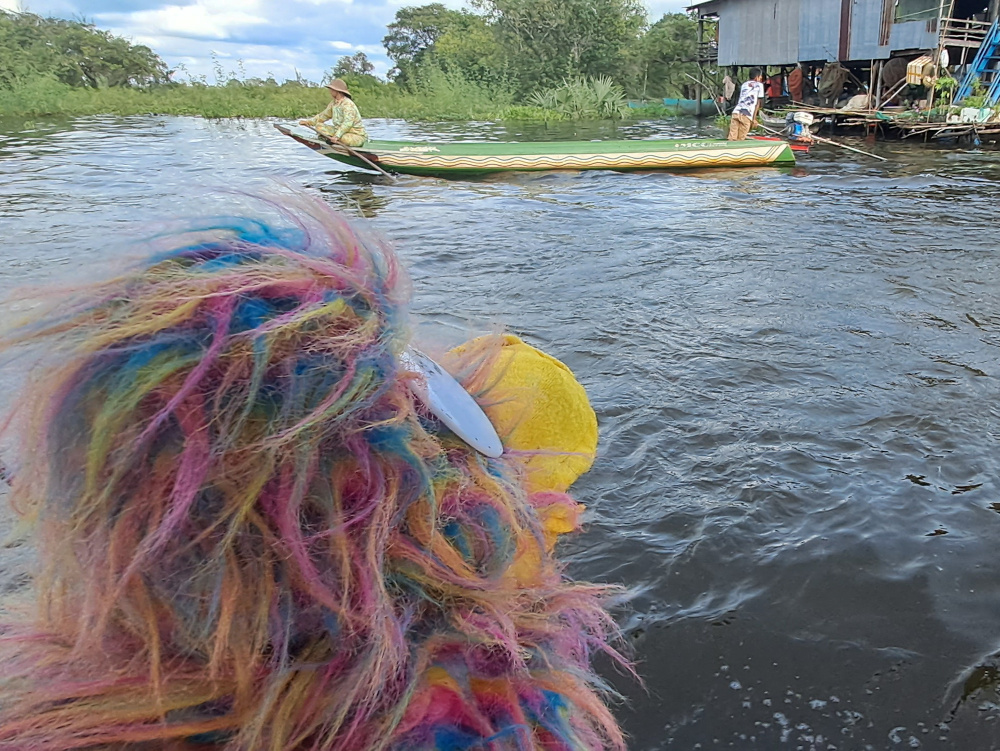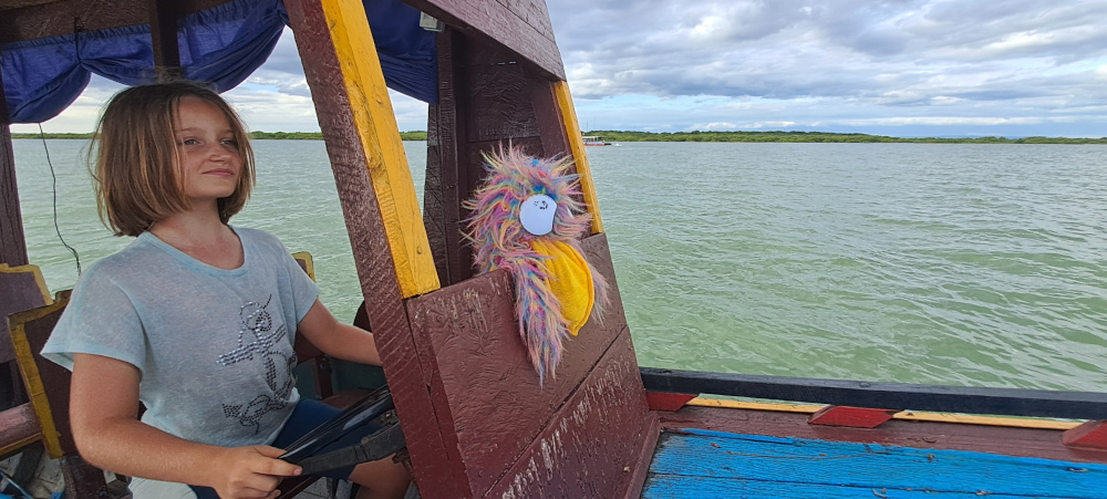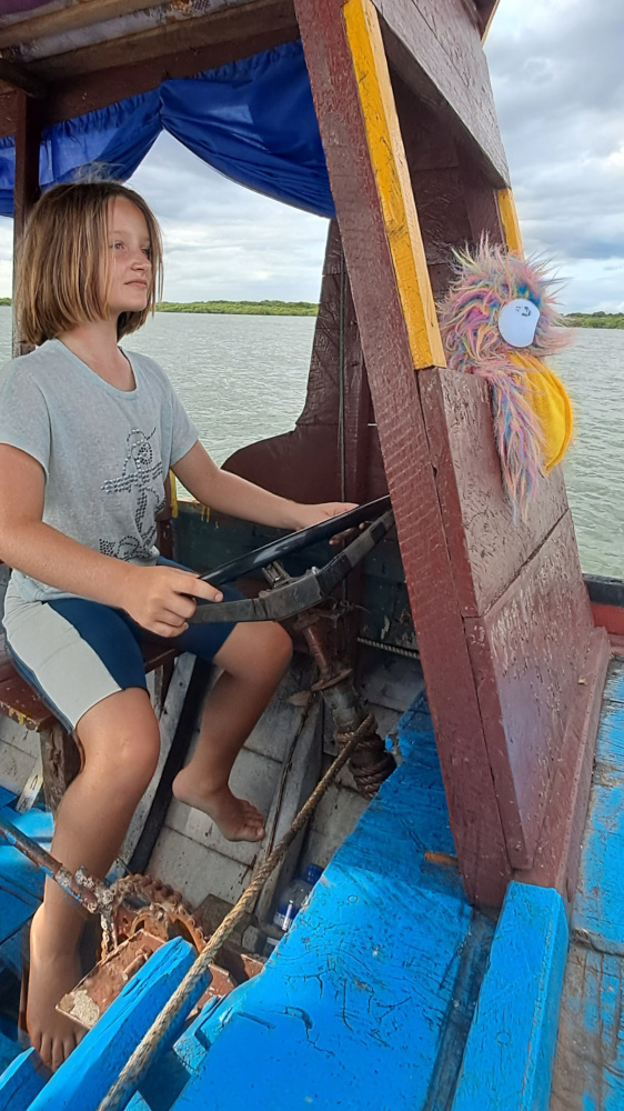 Ce matin, nos amis ont louĂ© un bateau. Un vrai, long et colorĂ©, prĂȘt Ă sâĂ©lancer sur le TonlĂ© Sap. Lou, trĂšs concentrĂ©e, prend la barre. Moi, jâai prĂ©fĂ©rĂ© me mettre Ă lâavant, les plumes au vent.