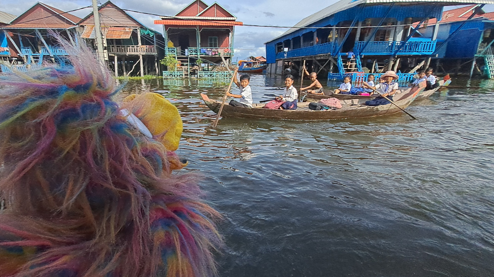 Autour de nous, les maisons sont toutes perchĂ©es sur de hauts pilotis. Certaines tiennent Ă peine debout, dâautres sont peintes de bleu, de vert ou de rouge vif. Ici, tout se passe sur lâeau : on pĂȘche, on vend, on lave, on rit, on va Ă lâĂ©cole… en bateau !