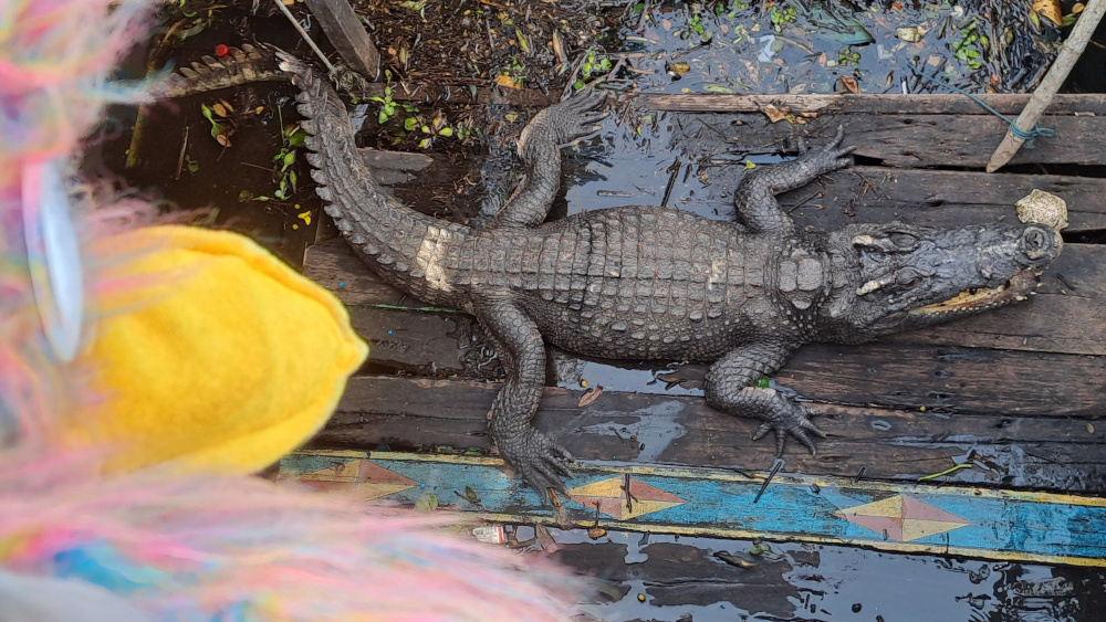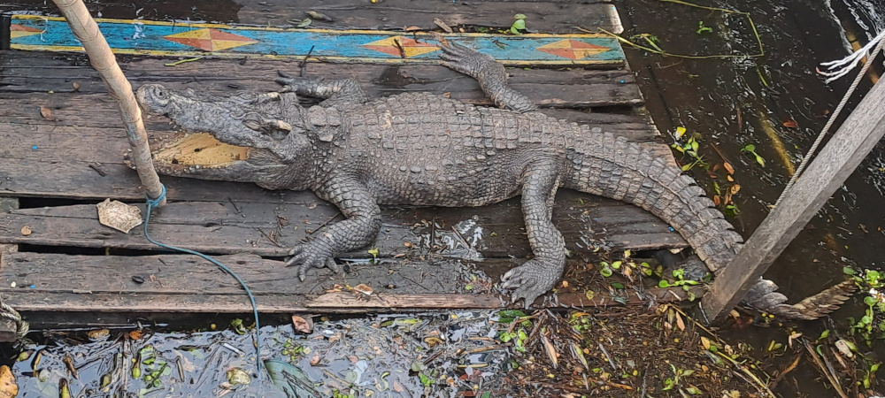 Le bateau fait une halte. Une famille nous invite à visiter leur ferme flottante⊠pleine de crocodiles !