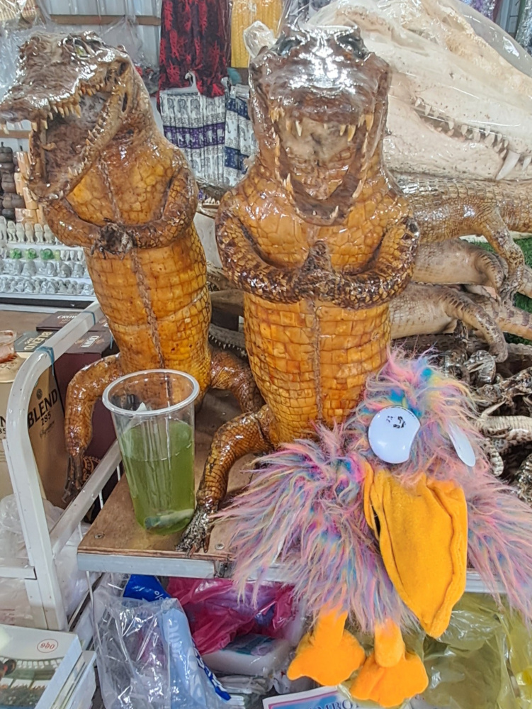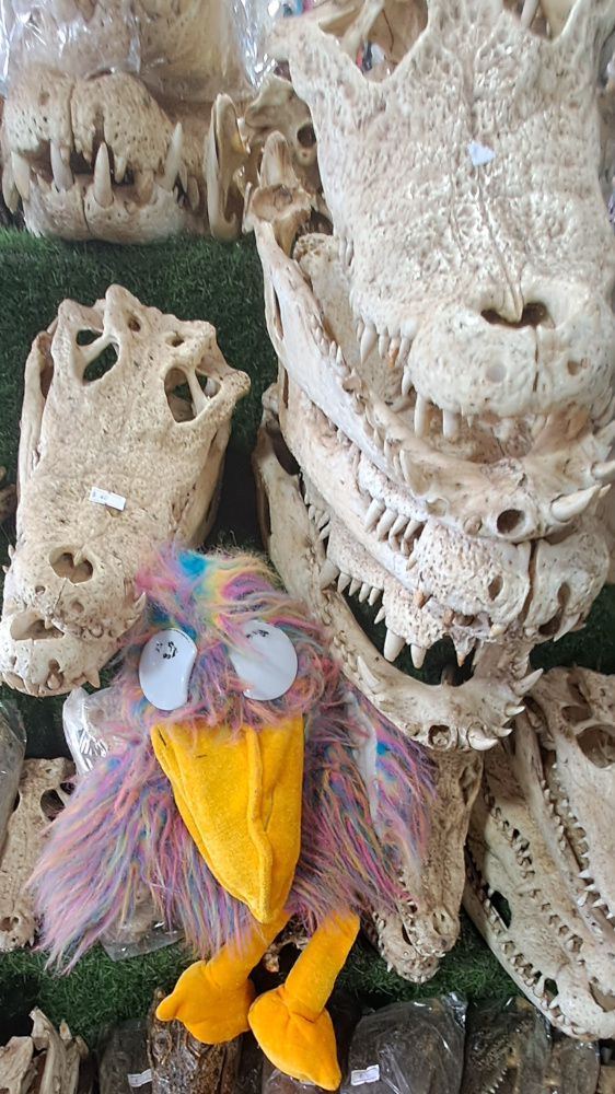Certains dorment Ă lâombre, dâautres font claquer leurs mĂąchoires. Lou me montre un crĂąne de crocodile emballĂ© dans du plastique : câest vendu aux touristes, comme les sacs et ceintures fabriquĂ©s avec leur peauâŠ