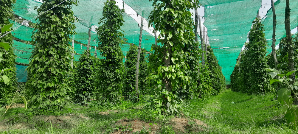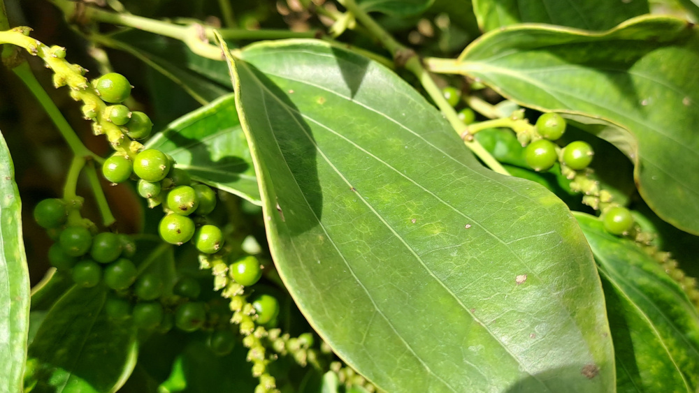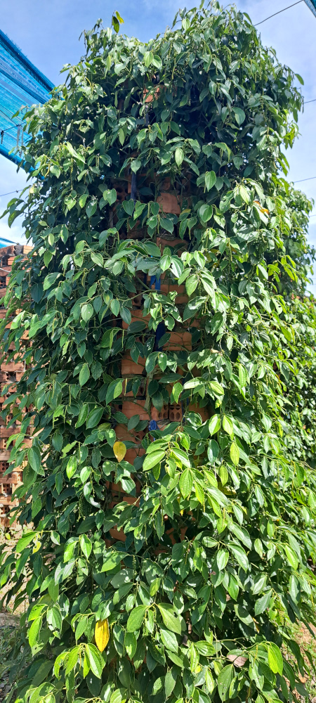 Sur place, j’ai découvert des allées entières de lianes vertes qui s’enroulent autour de colonnes en briques. Ce poivrier grimpant s’appelle Piper nigrum – le fameux poivre de Kampot !