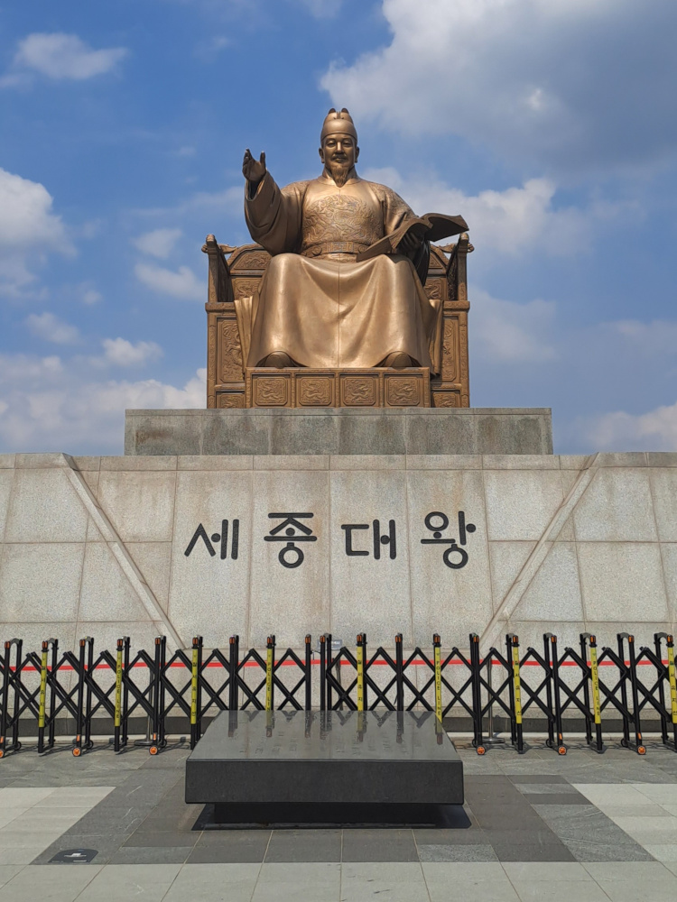 Observe les lettres sous la statue du roi Sejong. Copie-les à la main.