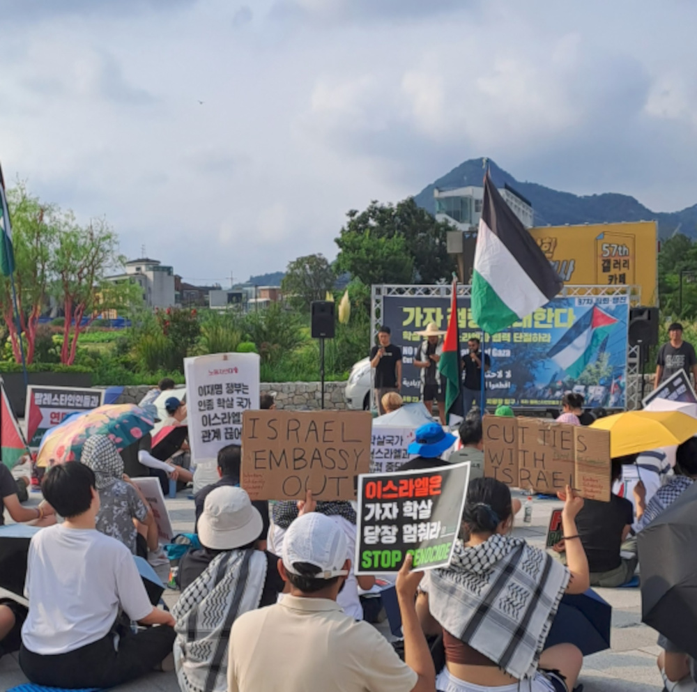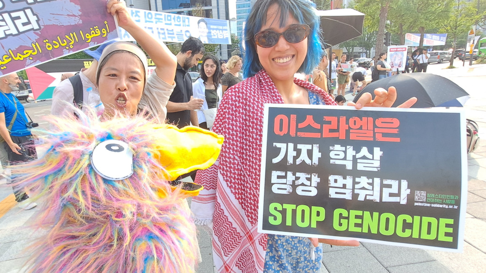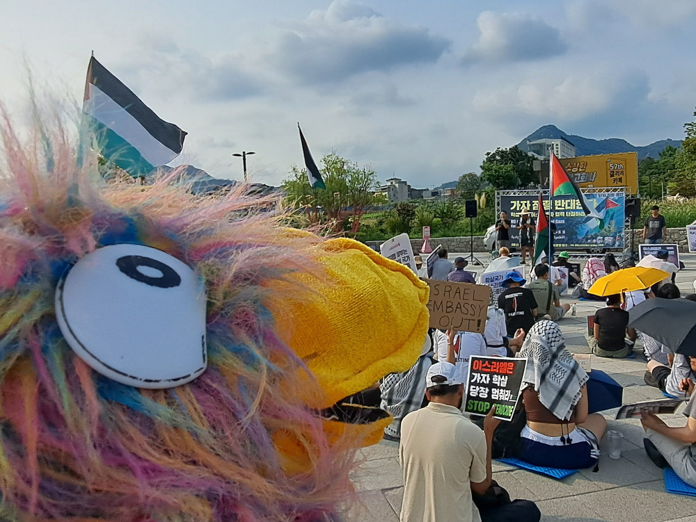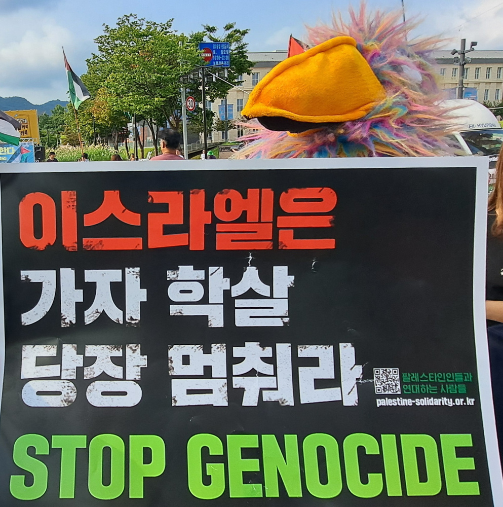 Moi, Rio, je suis un corbeau multicolore, libre de voler partout. Et je crois que tous les enfants du monde méritent de grandir en paix, de jouer, de rire, de manger à leur faim. Je suis contre toutes les violences, tous les massacres, où qu’ils soient. Et je trouve ça beau que des gens, ici en Corée, si loin de Gaza, prennent le temps de marcher pour demander justice.