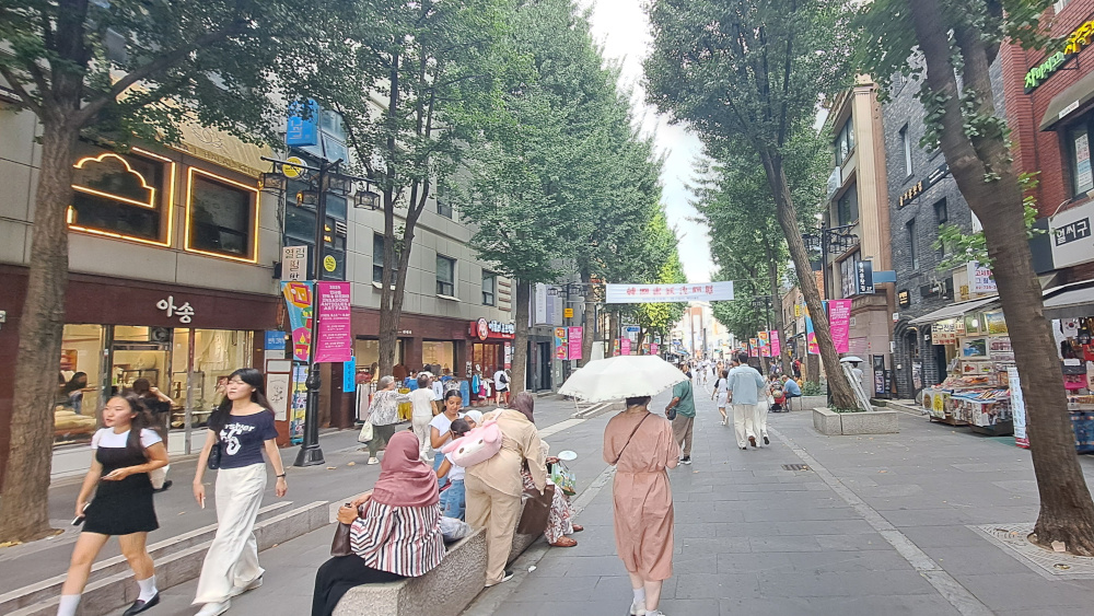 Le jour, c’est déjà super animé. Les boutiques s’ouvrent, les cafés débordent de jeunes qui rient, les gens sortent leurs glaces, leurs téléphones, leurs vêtements stylés.
