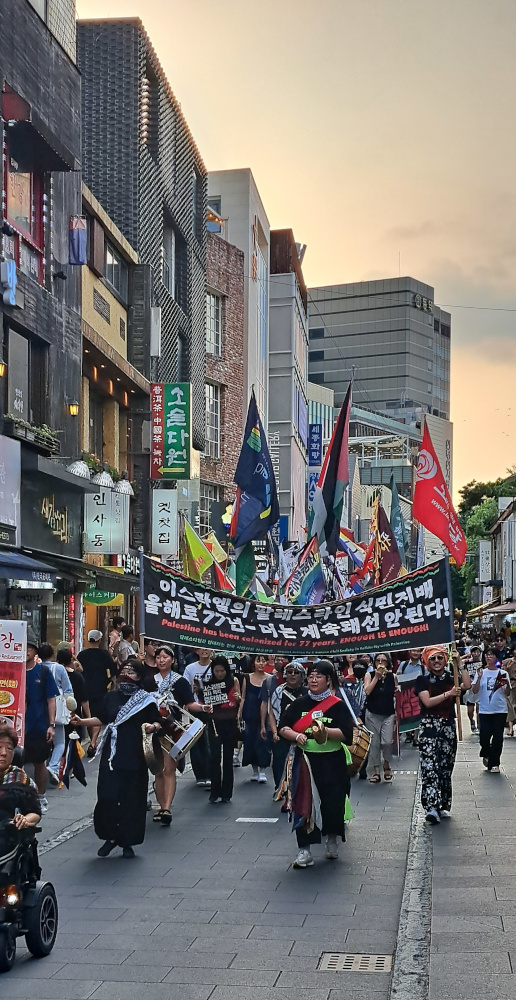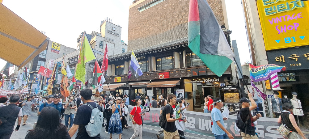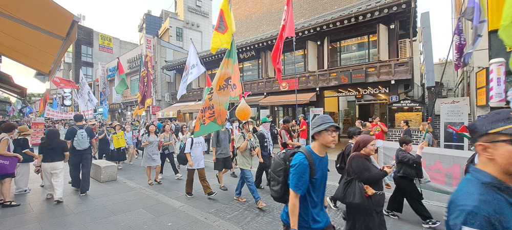Un après-midi, alors que je me promenais dans les rues animées de Séoul, j’ai entendu des tambours et vu beaucoup de drapeaux. Des gens marchaient ensemble, brandissaient des pancartes, chantaient, criaient parfois…
