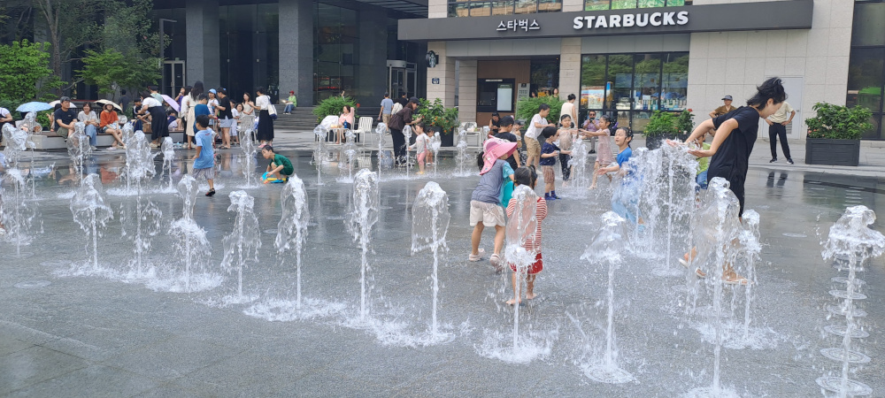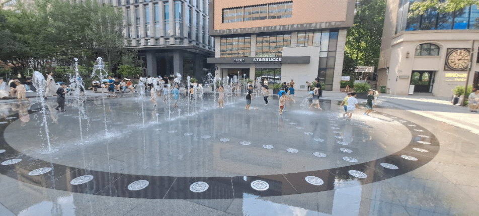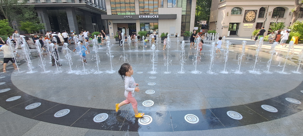 Heureusement, j’ai trouvé le paradis des petits (et des grands) : des fontaines qui jaillissent du sol au milieu des places ! Les enfants courent, sautent, glissent entre les jets d’eau, tout habillés. Ça rigole, ça crie, ça éclabousse. Moi, j’ai volé à travers les gouttelettes comme dans un arc-en-ciel 🌈