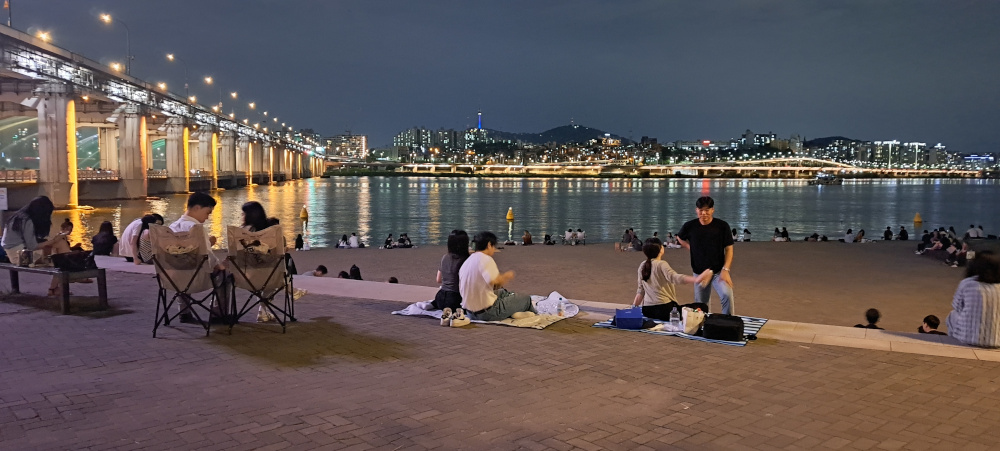 Le soir, quand le soleil se cache derrière les tours, les gens descendent sous le pont Banpo en plein centre de la ville.