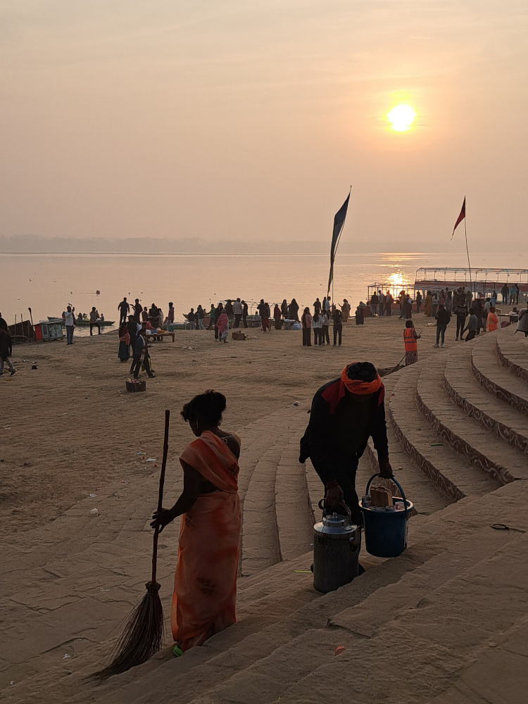 Il fait encore un peu nuit. L’air est frais, humide. Les marches des ghâts brillent doucement, lavées par la rosée ou peut-être par quelque chose de plus ancien.