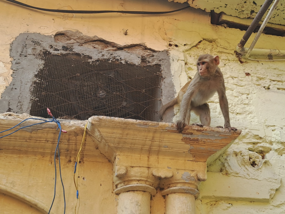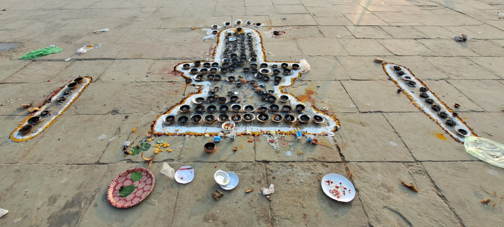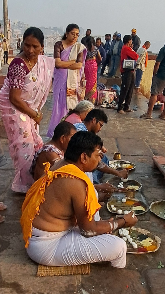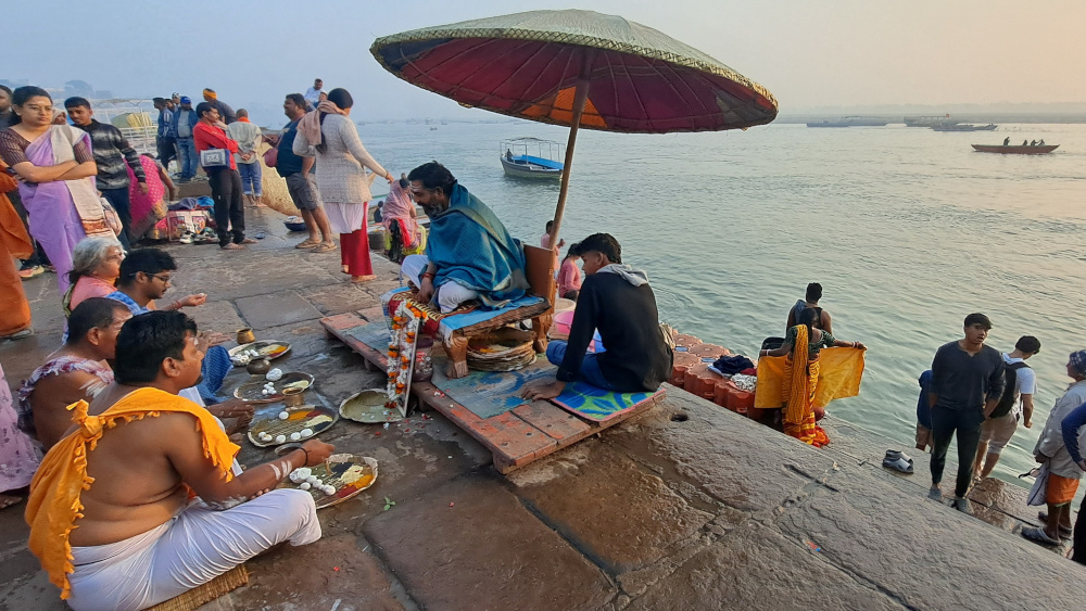 Des femmes en sari descendent avec des brassées de fleurs. Des hommes enveloppés de tissu blanc allument des petits feux, récitent des mantras. Un chien dort roulé en boule. Un singe fouille dans une assiette vide.
