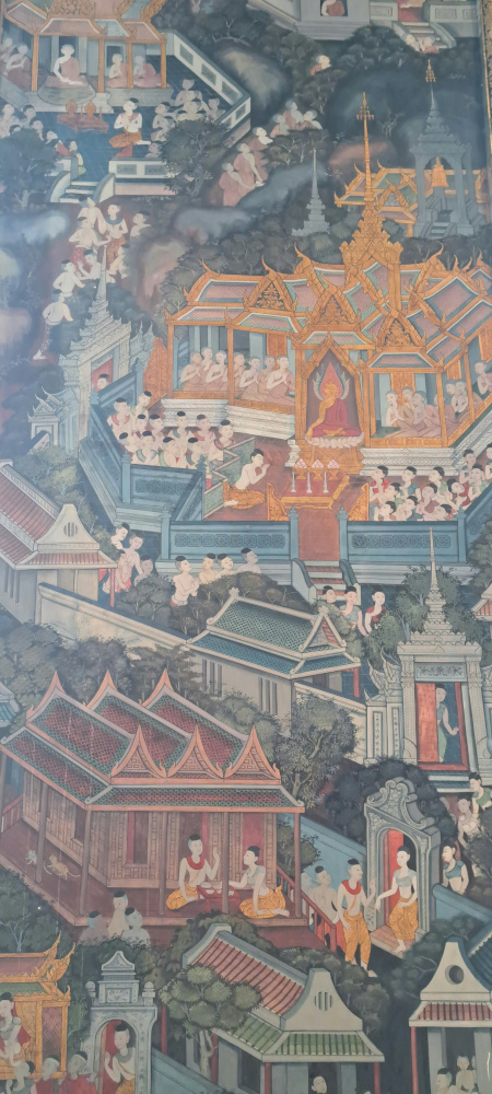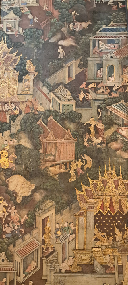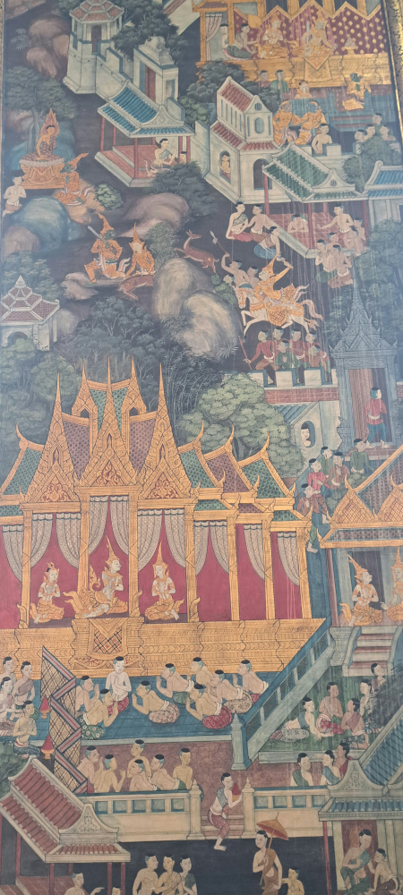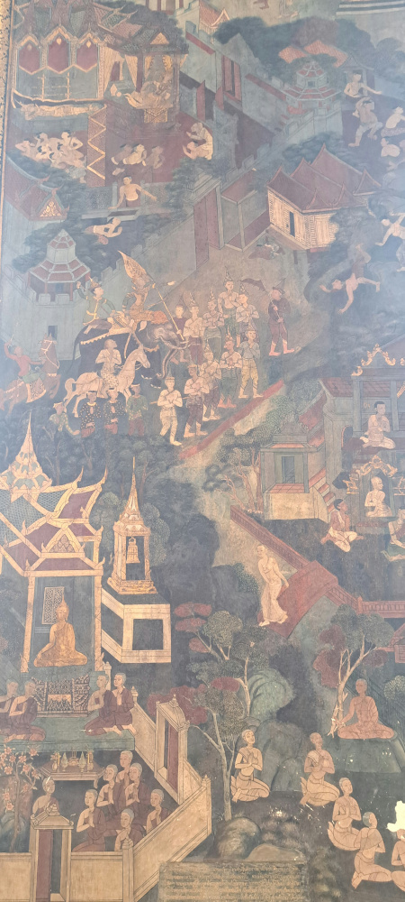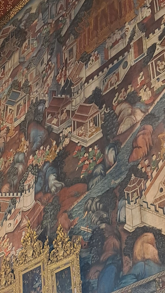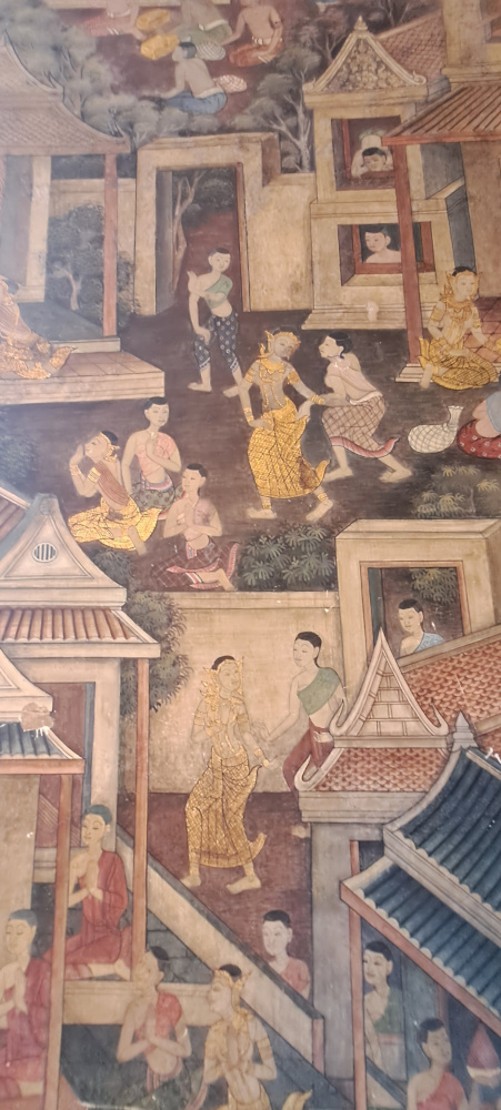 Autour du Bouddha, les murs sont recouverts de peintures anciennes. Elles racontent la vie de Bouddha, des légendes thaïes, et même des scènes de la vie quotidienne à l’époque. On dirait une immense bande dessinée pleine de détails ! J’ai passé un long moment à tout observer.