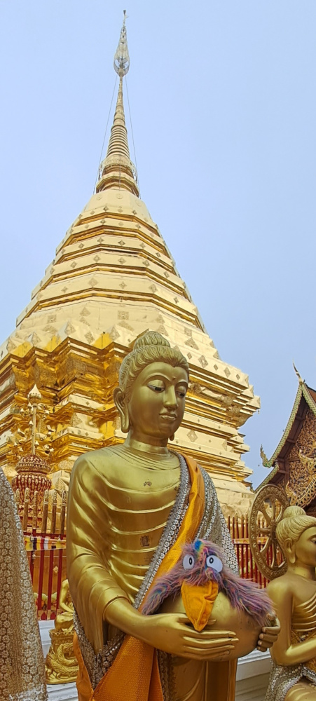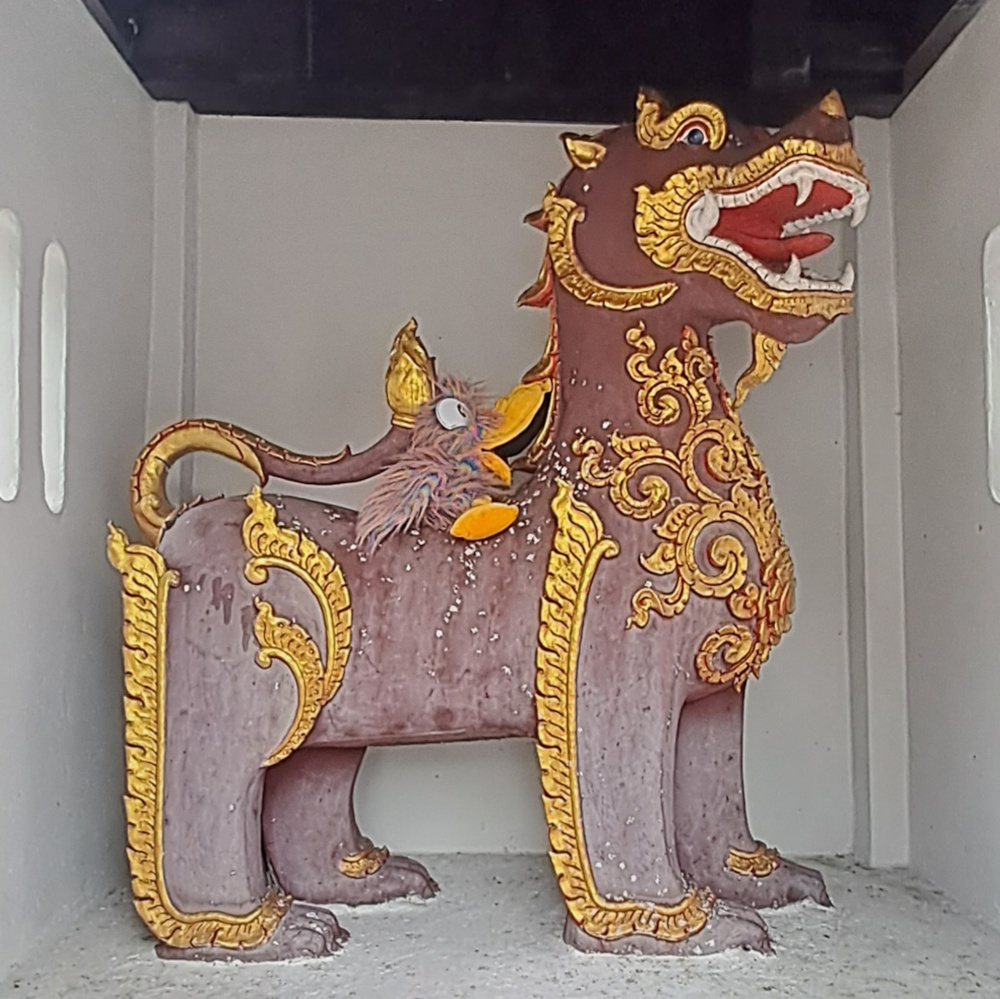 J’ai vu des tours dorées appelées chedi ou stūpa, qui brillent comme le soleil. Et parfois, je me suis perché sur de drôles d’animaux sculptés, mi-lion, mi-dragon, ou j’ai fait des pauses dans les bras de Bouddha, tous décorés de dorures précieuses. Majestueux, non ?
