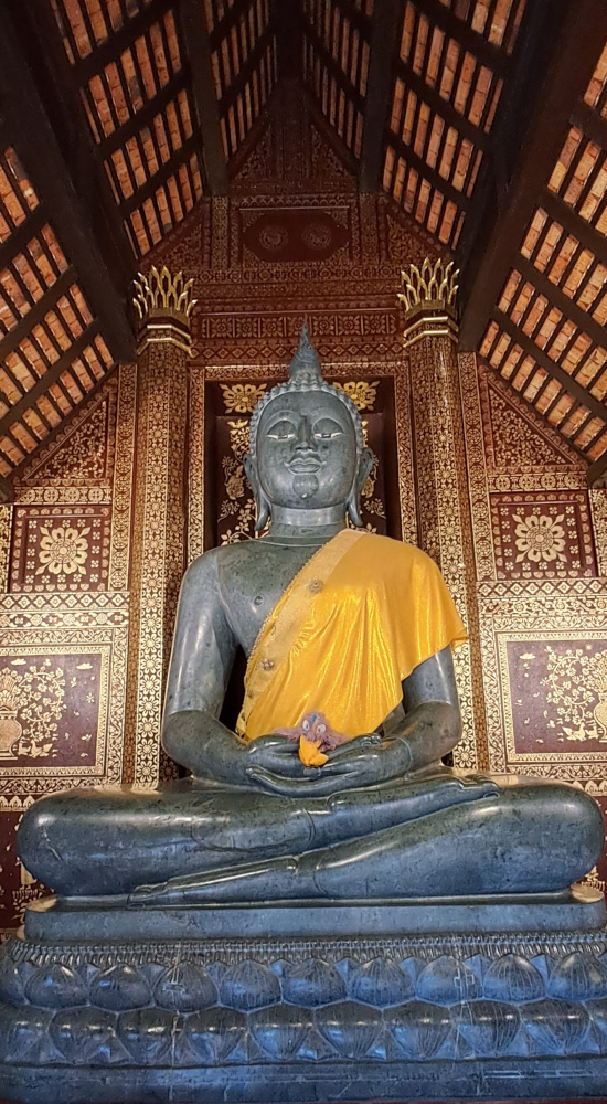 Quand je suis entré dans les temples, j’ai dû être très respectueux. Il y avait souvent une immense statue de Bouddha, toute dorée ou en jade. Bouddha était assis en tailleur, les yeux mi-clos, l’air paisible. Il portait une sorte de tissu orange sur l’épaule, comme les bonzes.
