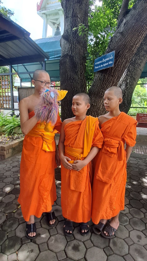 Et devinez quoi ? J’ai rencontré des jeunes bonzes ! Ce sont des garçons habillés tout en orange, qui vivent au temple. Ils m’ont souri, m’ont posé plein de questions… et ils ont même joué un peu avec moi ! Ils apprennent la sagesse, le calme, et lisent des textes très anciens.