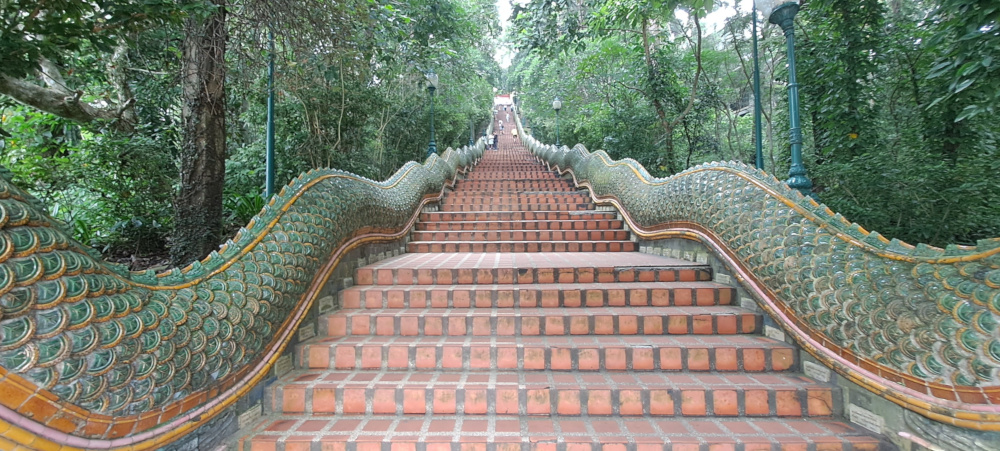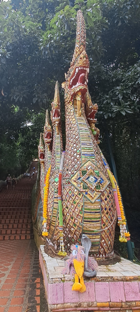 Avant même d’entrer dans un temple, j’ai dû grimper de longues marches, protégées par d’immenses dragons multicolores : les Nagas ! Leurs écailles brillent, leurs yeux sont grands ouverts… Ils n’ont pas essayé de me manger, ouf !