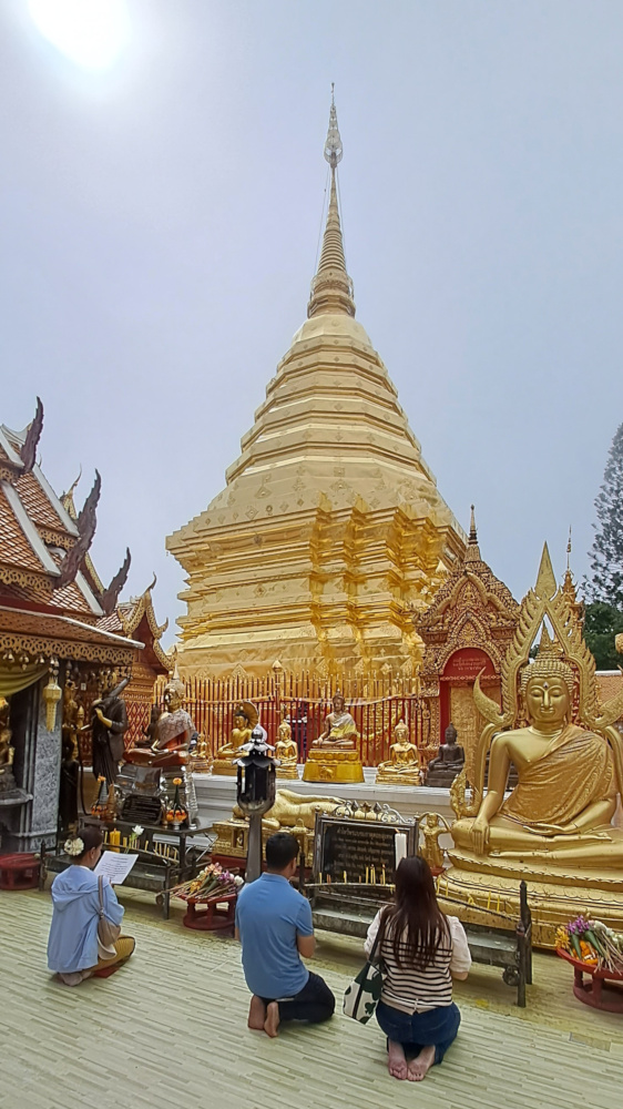 A Chiang Mai, j’ai découvert des endroits incroyables qu’on appelle des temples bouddhistes. Ce sont des lieux sacrés, très calmes, très beaux, où on vient pour prier, méditer et faire des offrandes.