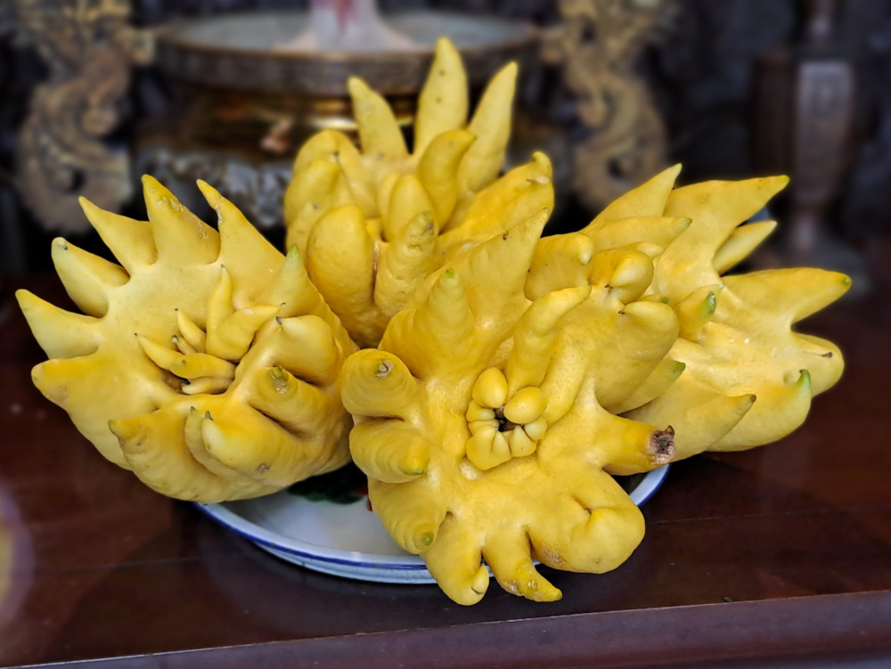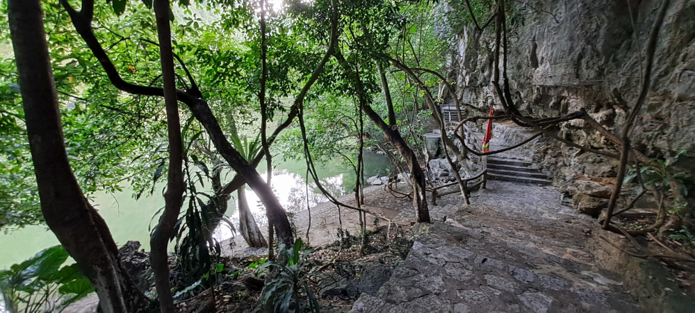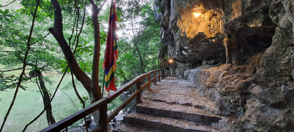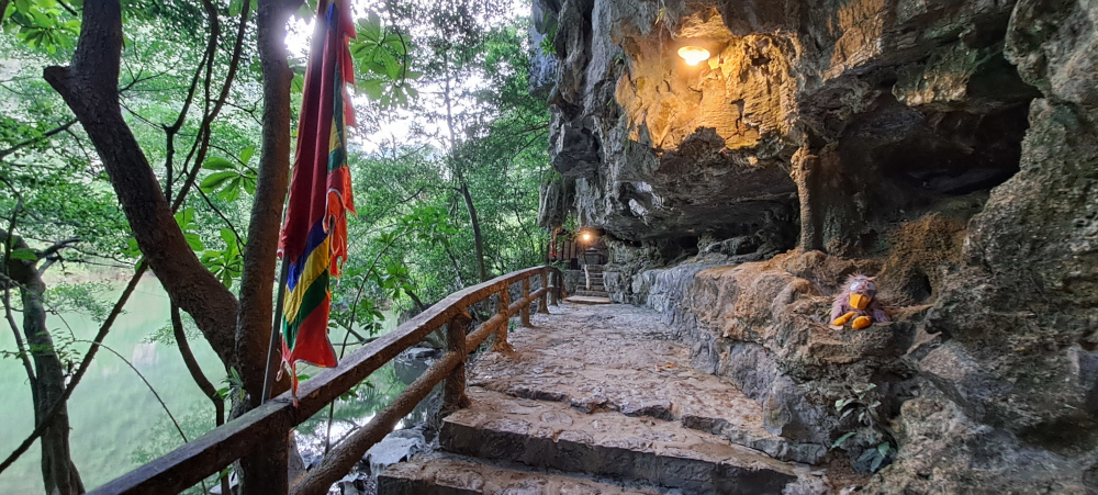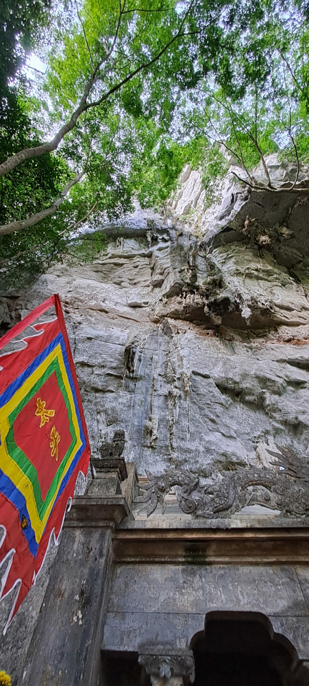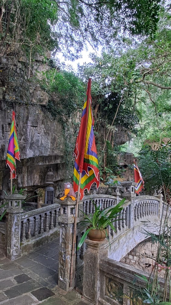Après un long moment sous la montagne, on débarque sur un petit quai. Devant moi, un temple presque invisible, collé à la falaise : c’est le temple Cao Son, dédié au dieu de la montagne. Des fleurs jaunes, de l’encens, des lanternes, et des offrandes de fruits bizarres (tu connais la « main de Bouddha » ? Un citron tout écarté comme des doigts !).