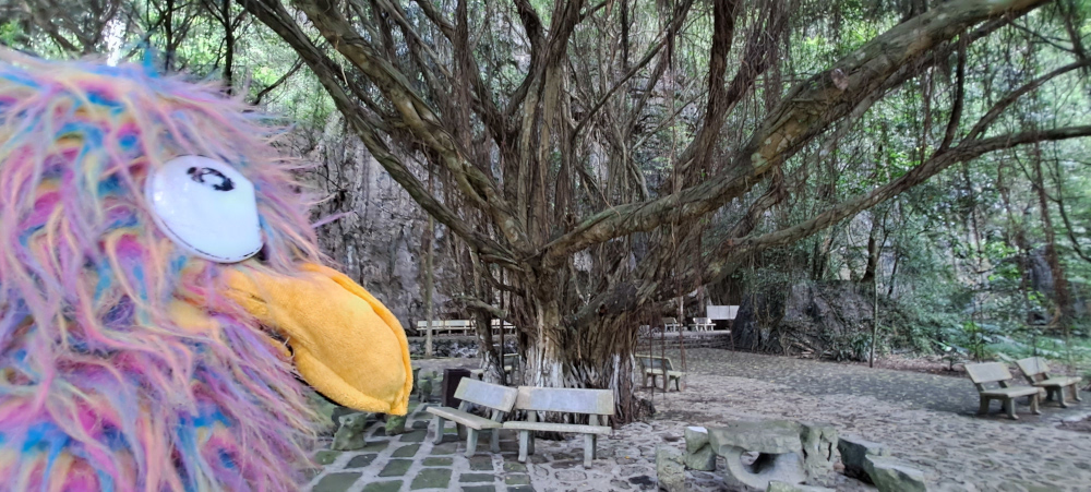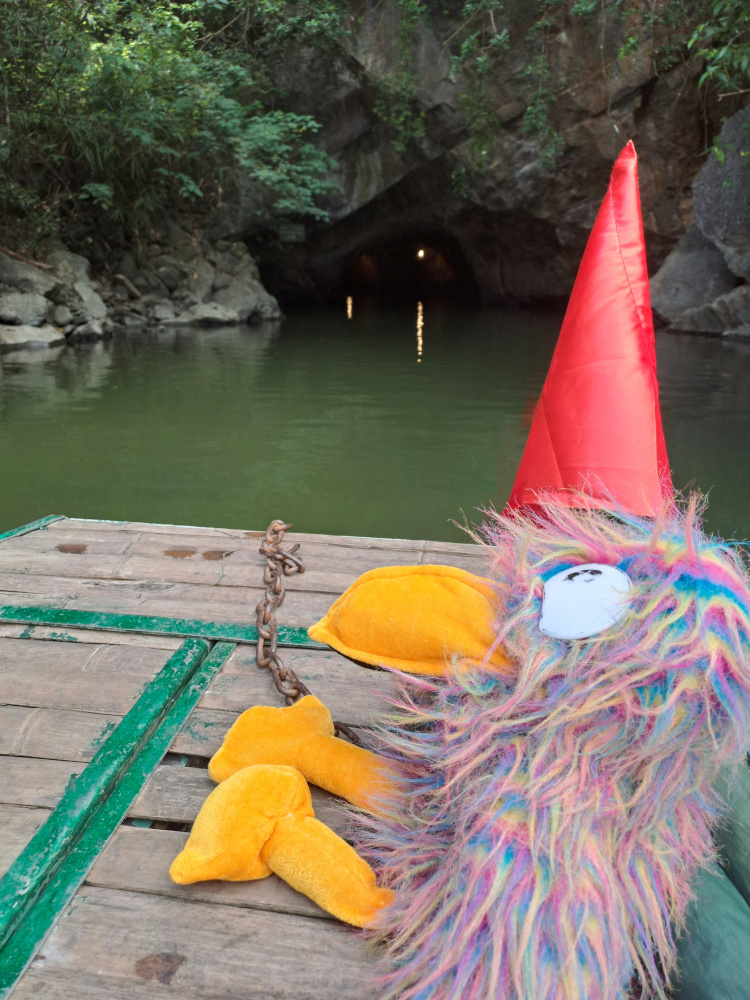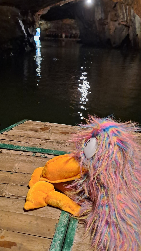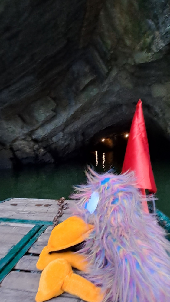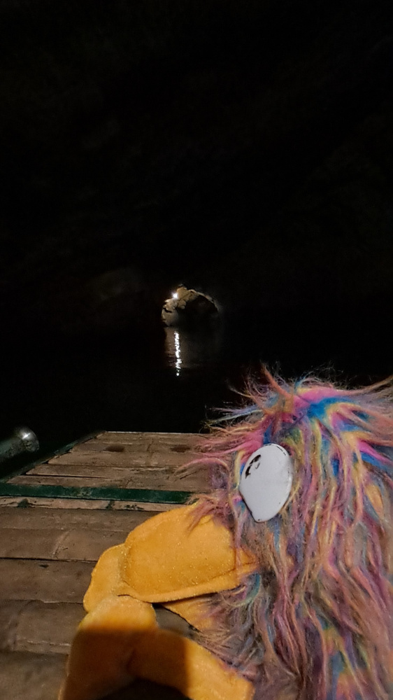 Dès les premiers coups de rame, la lumière disparaît : on entre dans une grotte. Le plafond est si bas qu’il faut baisser la tête pour ne pas se cogner. À l’intérieur, il fait presque noir. Seule une petite lampe au plafond éclaire l’eau noire. C’est comme glisser dans un tunnel de roche, un peu magique, un peu effrayant. Et puis soudain, la lumière revient : on ressort de l’autre côté de la montagne !