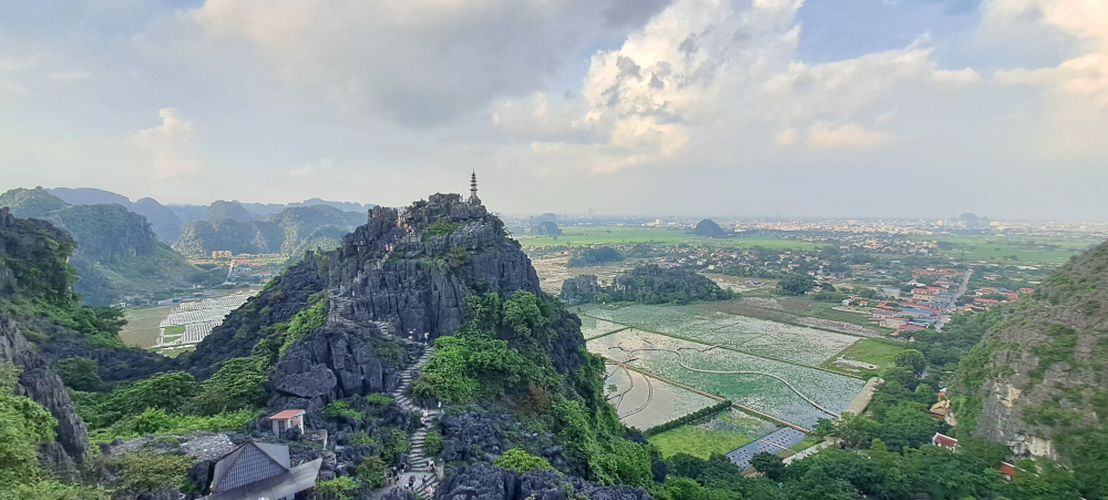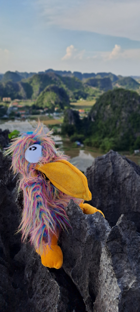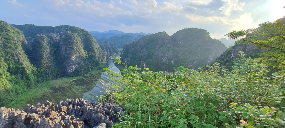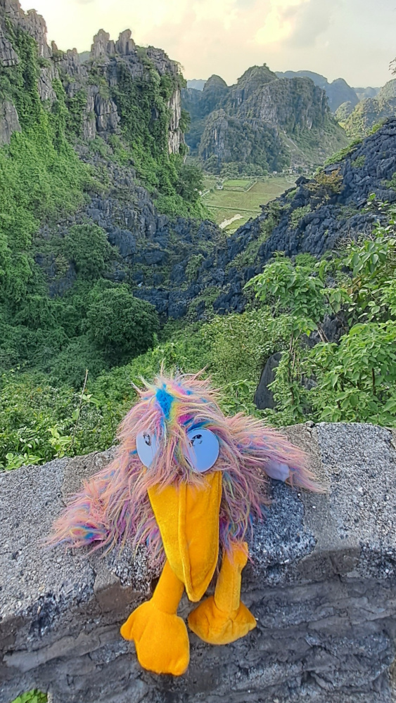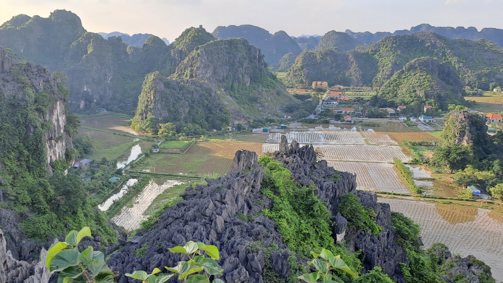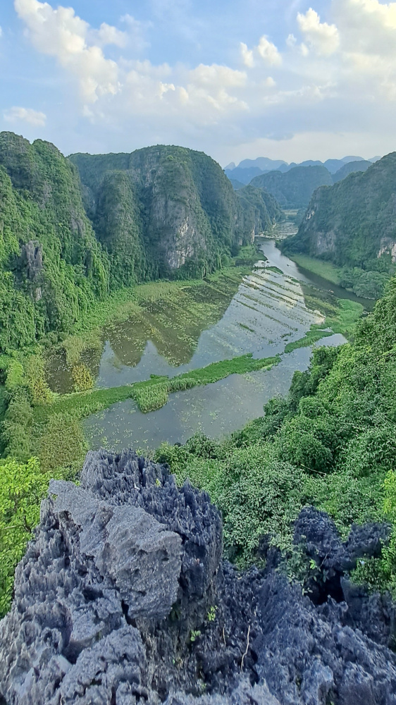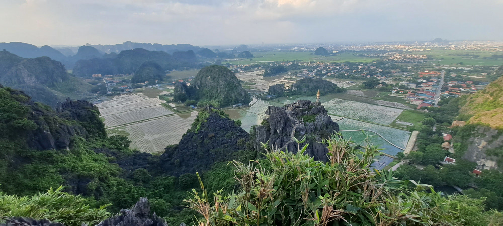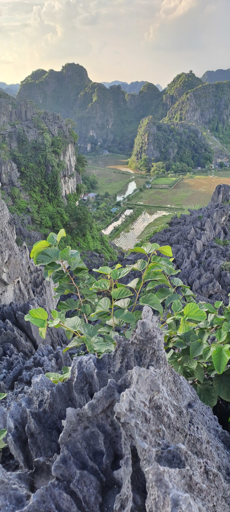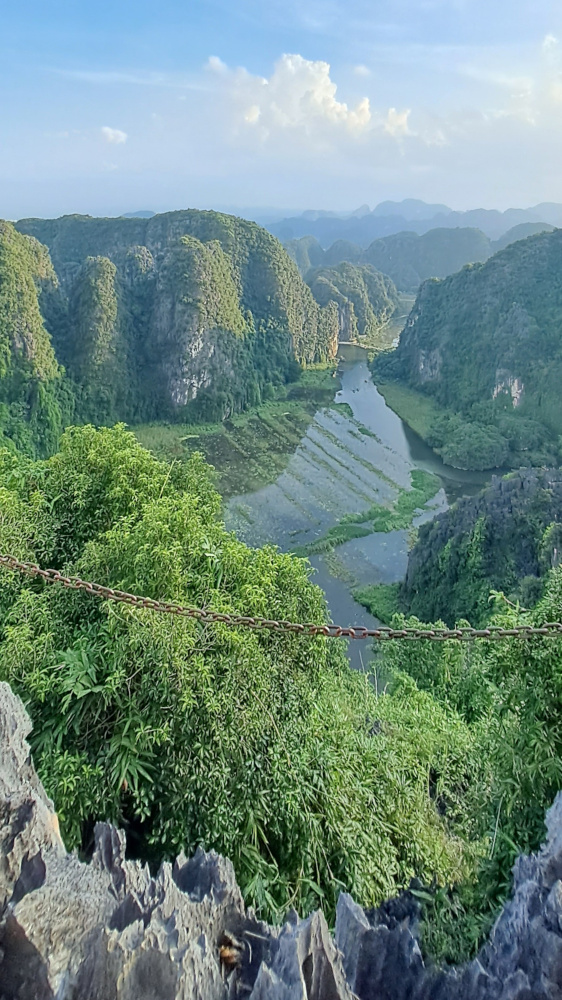 Ă mi-chemin, je me retourne. đź Et là ⊠wahou. Tout le paysage sâouvre derriĂšre moi : les riziĂšres, bien droites, inondĂ©es de lumiĂšre ; les montagnes karstiques, dressĂ©es comme des dos de dinosaures endormis ; des chemins, des maisons, tout petits, comme des jouets.