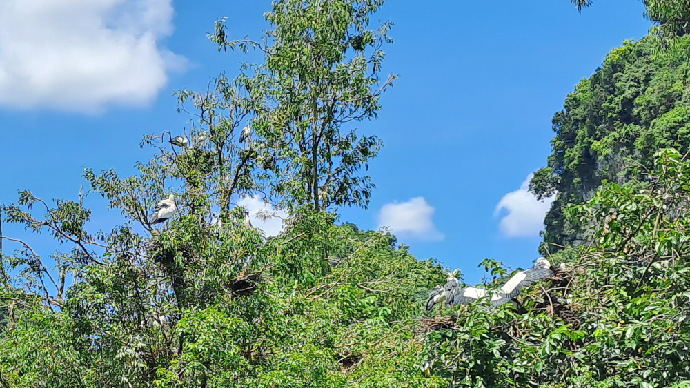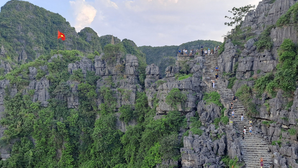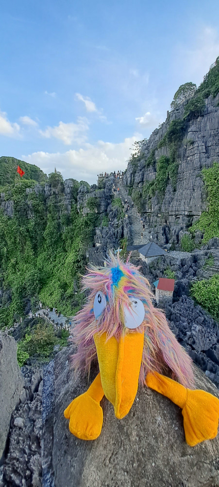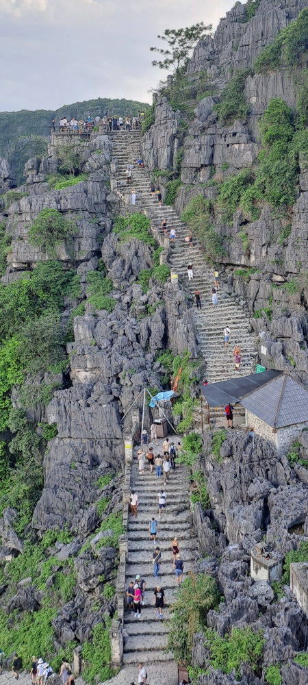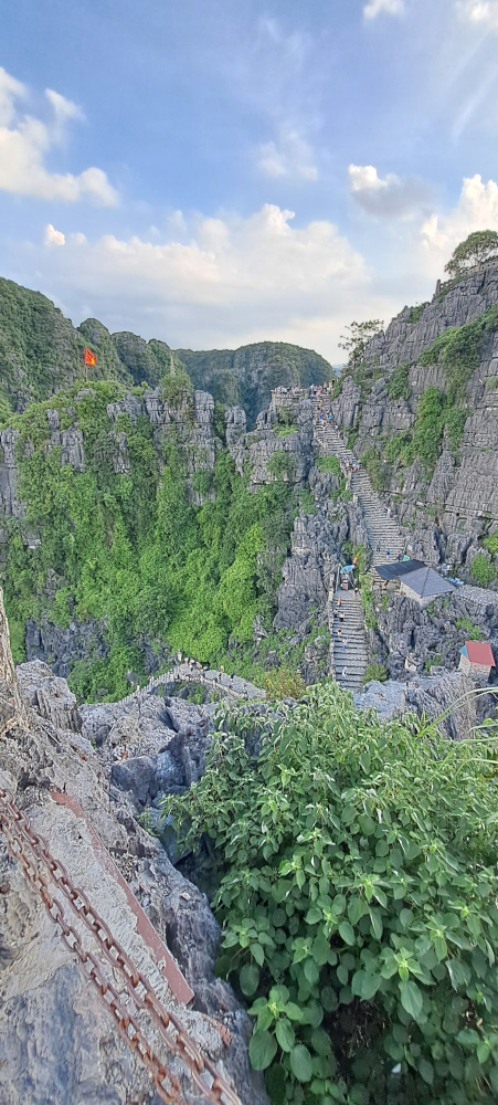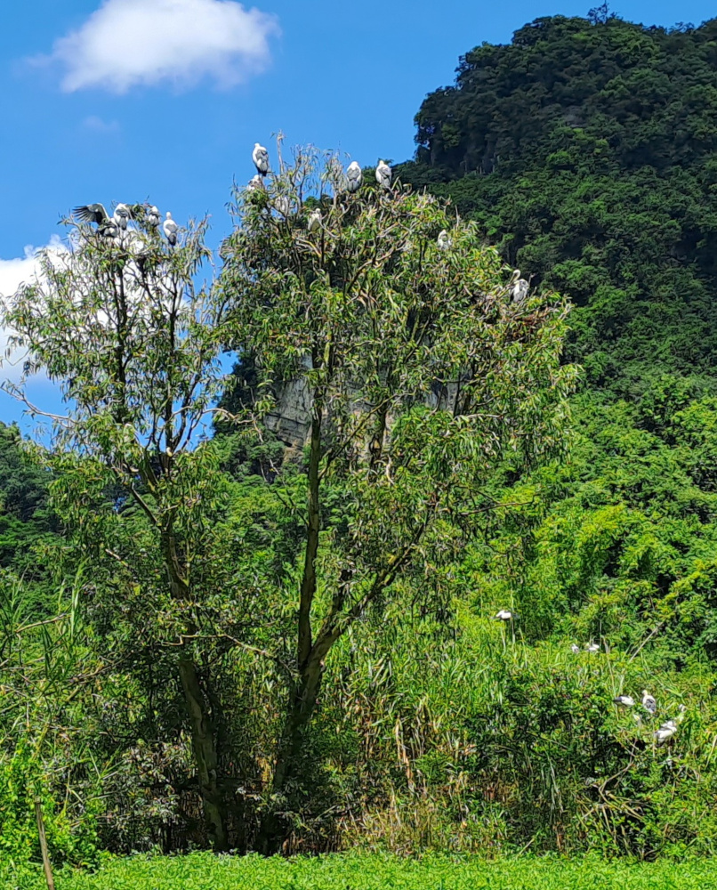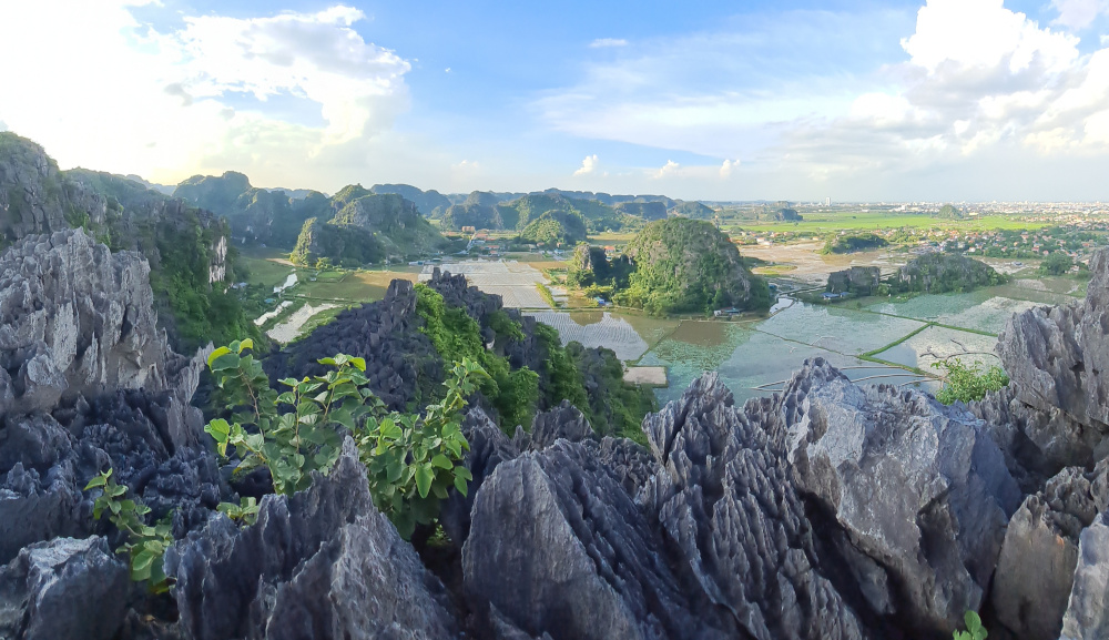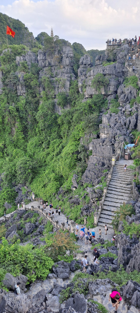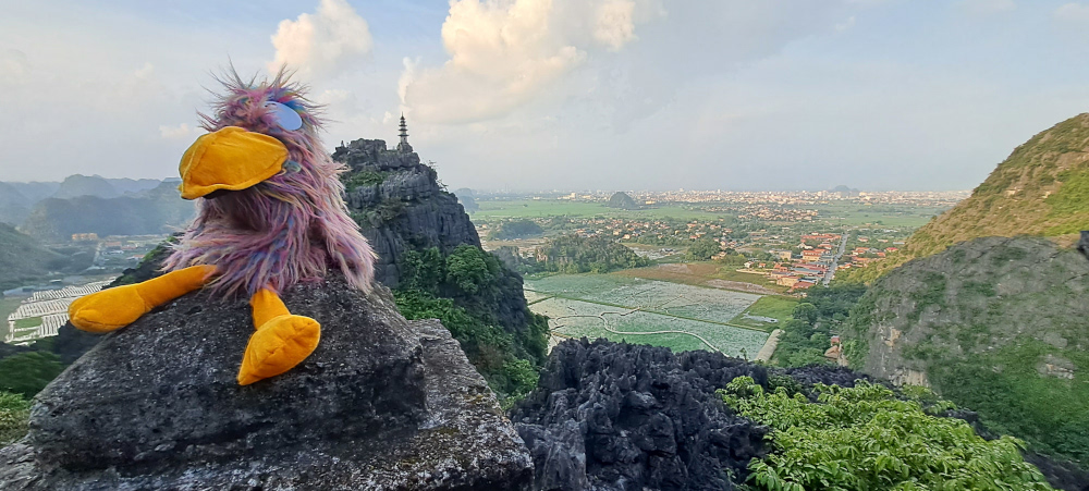 Ă mi-chemin, je me retourne. đź Et là ⊠wahou. Tout le paysage sâouvre derriĂšre moi : les riziĂšres, bien droites, inondĂ©es de lumiĂšre ; les montagnes karstiques, dressĂ©es comme des dos de dinosaures endormis ; des chemins, des maisons, tout petits, comme des jouets.