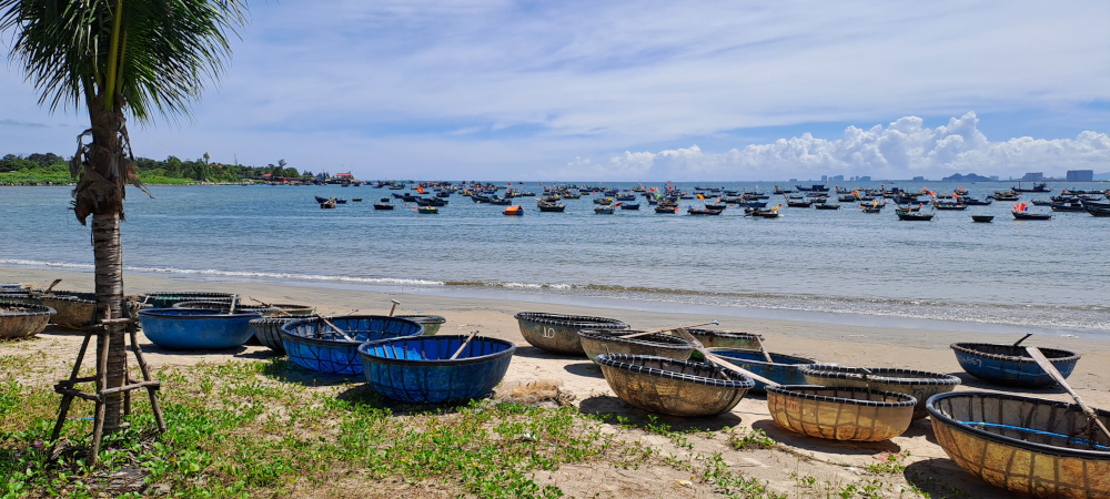 Sur la plage, je me pose sur le bord d’un bateau bien rond. Ce sont des bateaux paniers, faits de bambou tressé et enduits de résine. Ils tournent un peu dans tous les sens quand on rame, mais les pêcheurs vietnamiens les utilisent avec agilité. C’est leur secret !