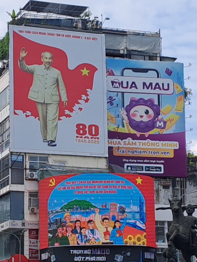 Entre deux coups de klaxon, je lève les yeux : immenses panneaux rouges, statues de Hô Chi Minh, et juste à côté… des pubs pour des bubble tea ou des applis de shopping rigolos. C’est ça, Saigon : un mélange d’histoire et de futur.